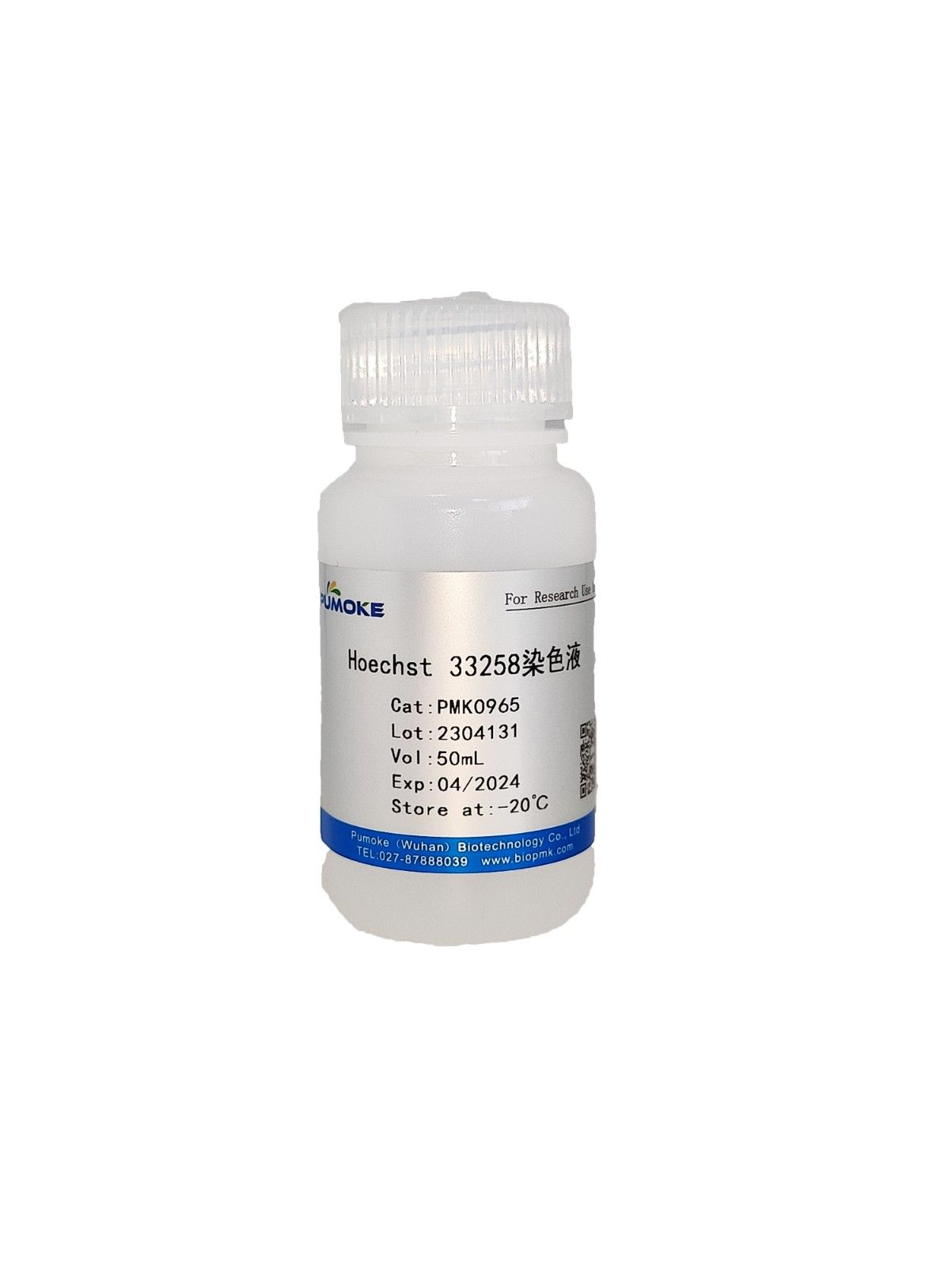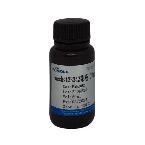 Hoechst 33258是可透過細胞膜并對DNA染色的細胞核染色試劑,在嵌入雙鏈DNA后釋放強烈的藍色熒光。Hoechst 33258常用于細胞凋亡檢測,染色后用熒光顯微鏡觀察或流式細胞儀檢測