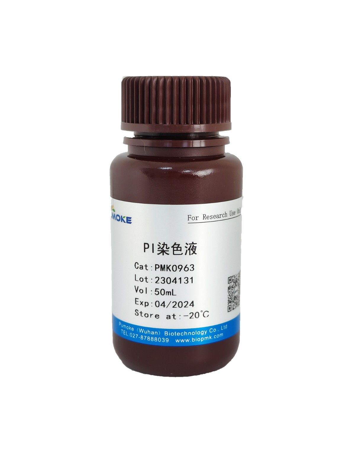 碘化丙啶(Propidium Iodide, PI)不能穿透完整細胞膜,但對凋亡晚期細胞和死細胞的破損細胞膜能夠穿透,并使細胞核紅染。常被用來與 Calcein-AM 或者 FDA 等熒光探針一起使用,能同時對活細胞和死細胞染色