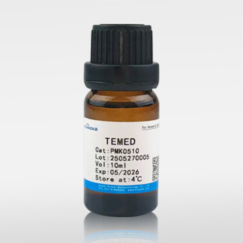 TEMED是聚丙烯酰胺凝膠聚合的重要催化劑,在制備聚丙烯酰胺凝膠時,TEMED配合過硫酸銨(AP)使用,通過催化AP產生自由基,加速催化聚丙烯酰胺的聚合反應。