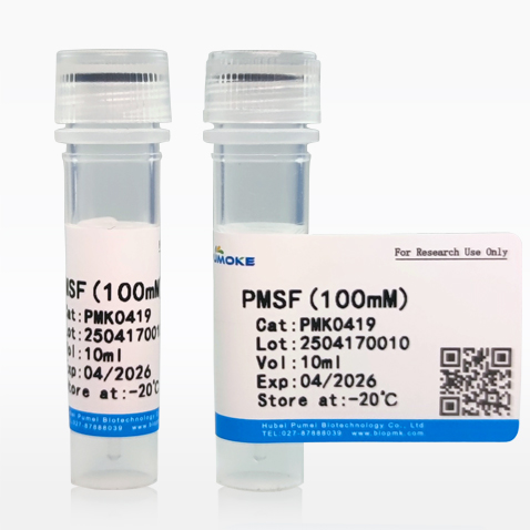 PMSF為常用生化試劑,采用進口試劑配制,用于抑制絲氨酸蛋白酶,如胰蛋白酶,胰凝乳蛋白酶,同時也可抑制半胱氨酸蛋白酶和乙酰膽堿酯酶,其有效濃度為0.1~1mM。