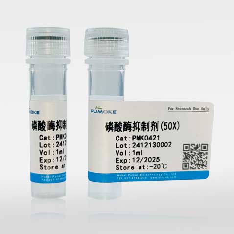 磷酸酶抑制劑(50×)為多種磷酸酶抑制劑混合液,可有效抑制酪氨酸磷酸酶、絲氨酸磷酸酶、蘇氨酸磷酸酶、酸性和堿性磷酸酶等各種磷酸酶。