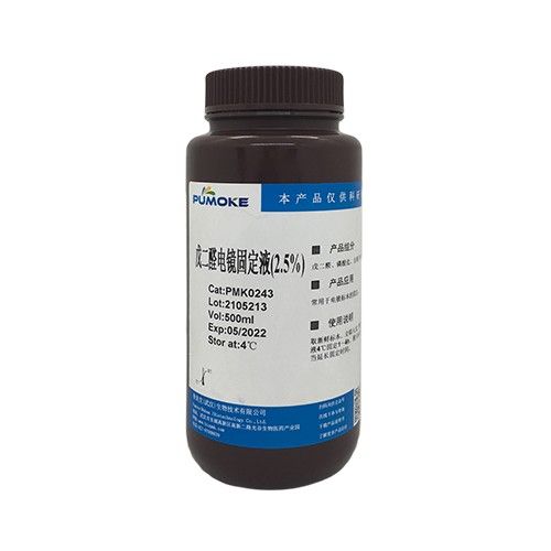 戊二醛固定液(2.5%,電鏡專用)由戊二醛、磷酸鹽、去離子水等組成,pH7.2~7.4,該固定液對細胞核、細胞漿的細微結構固定效果好,經常用于電鏡標本的固定。