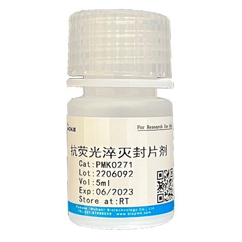 抗熒光淬滅封片劑用于對熒光組織和細胞樣品的封片,添加獨有的抗熒光淬滅劑成分,兼容多種熒光染料,可保護整個可見光譜和紅外光譜,防止熒光信號淬滅;樣品封片后 4℃或-20℃避光保存2周以上,仍可維持原有發光強度。